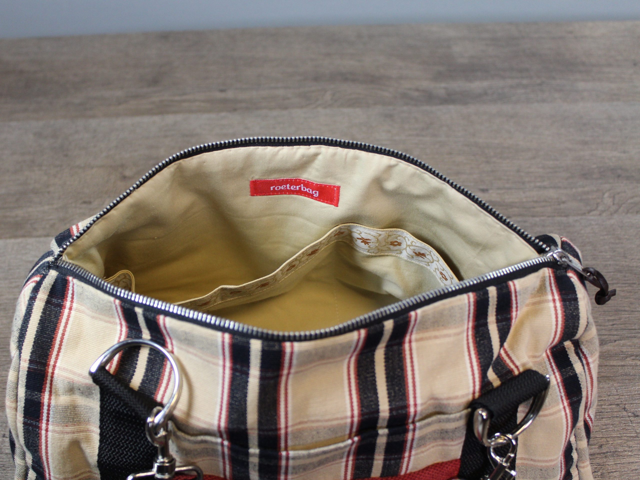 Die Tasche ist nicht sehr groß und doch bietet sie genug Platz für Kleinigkeiten. Der kurze Gurt (50cm) kann an der Hand und auch über der Schulter getragen werden. Im Inneren befinden sich zwei Steckfächer.