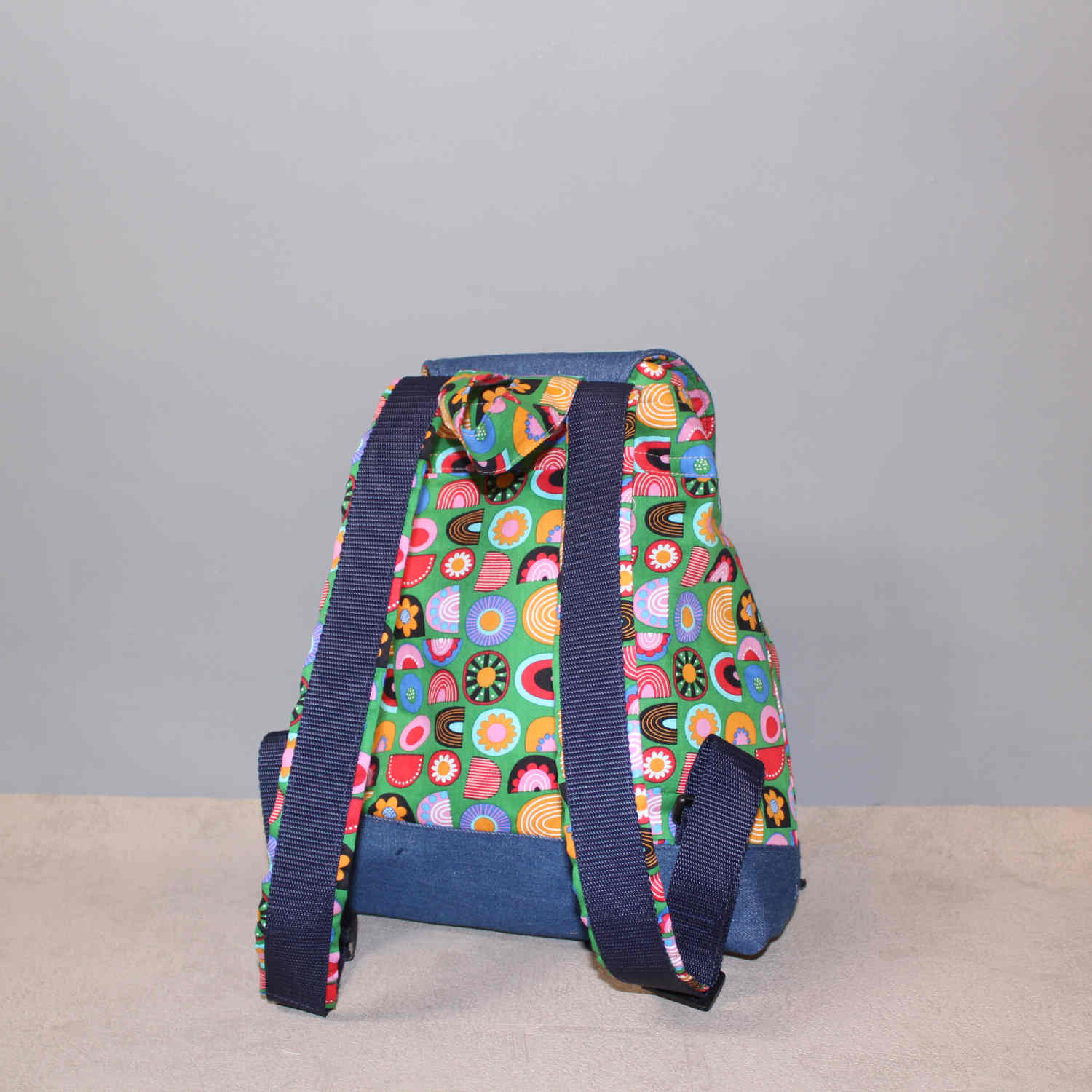 Ein kunterbunter Kinderrucksack aus Baumwolle, abesetzt wurde er mit einem passenden Jeansstoff der unten an der Passe mit kleinen bunten Autos bestickt ist. Auf der Lasche befindet sich ein farblich passendes Nilpferd. Im Innenraum ist genügent Platz für eine Brotdose, Kuscheltier und eventuell für Hausschuhe, zusätzlich hat der Rucksack Innen noch eine kleine Tasche. Er ist ideal für den Kindergarten oder andere Dinge.